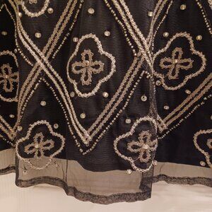 Fits like a crop tank. Silver and clear colour embroidery and beaded accents. Back of tank has a mesh outer layer and cross pattern around the backline (up to neckline). 100% polyester.