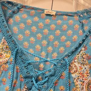 Embrace effortless bohemian style with this Hollister boho blouse. Featuring a vibrant blue base with a mix of paisley and floral prints, this lightweight and flowy blouse is perfect for warm weather. The crochet-trimmed neckline adds a delicate touch, while the adjustable drawstring with tassels allows for a customizable fit. Short sleeves and a relaxed silhouette make it an easy-to-style piece for casual outings or festival-ready looks.