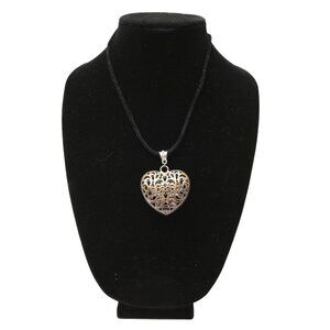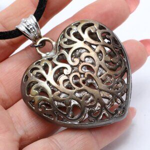Hollow Ornate Heart Pendant Silver Necklace Fabric Cord Band Boho Oversized