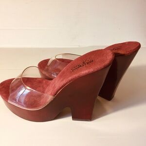 Platform and heel made of wood, colour Wine with clear upper material, 5 inch heel.