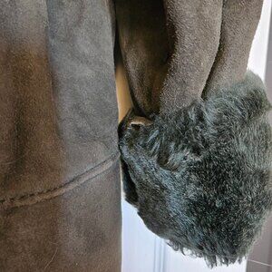 The exterior features a rich, dark brown/olive suede finish, while the interior is lined with luxuriously dark green/black shearling wool that extends to the collar and cuffs, providing exceptional warmth and comfort.