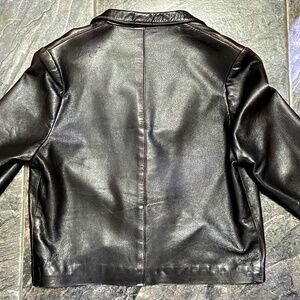 Mint condition leather jacket from haute couturier Holt Renfrew. Exclusive Ligne privée, made in France. Colour is graphite, almost black. Supple fine grain leather outside, polyester lining inside. Fits Canadian size 10-12. See pictures for measurements taken. Has seen little to no use and is in excellent condition.