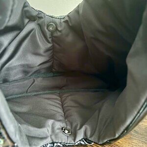 This black hobo bag features a unique crescent-like shape and a glossy, reflective finish, adding a sleek touch to your outfit. The unstructured form and stiff material allow it to maintain its curved silhouette. Bag only.