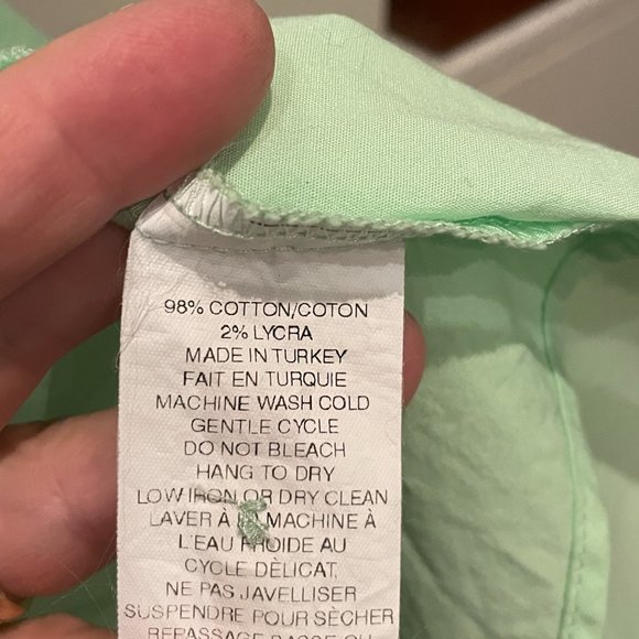 Selling a pristine Holt Renfrew pale green button down shirt for women. This is a classic fitted shirt. Slight stretch. 98% cotton, 2% lycra. Still has the extra button on the tag. Size Medium. Gently used. It's hard to capture the colour, but in real life it looks somewhere in between the green in the first picture and the pale green in the others.