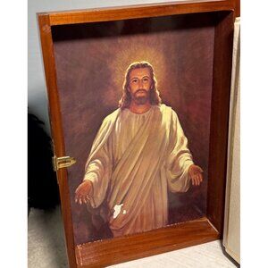 Minor scuff marks on Jesus image. Small mark on back of Bible. Some scratch marks on wood box