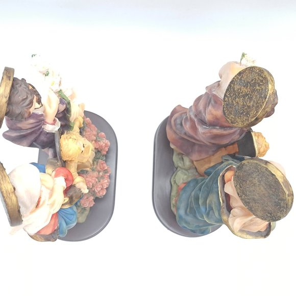 I have 2 resin statues depicting the Holy Family, vintage but unused; they are hand painted and have some differences. The statues show St. Mary and St. Joseph over an infant Jesus. All 3 have halos and flowers are springing up around Jesus, symbolizing that he is the giver of life. It was made by Creations Bella, who provide statuary to St. Joseph's Oratory in Montreal and other religious institutions. They discontinued the statue years ago leaving it in the upstairs of their warehouse where I was lucky enough to scoop them up. If you have a preference for 1 or the other just message me when you buy.