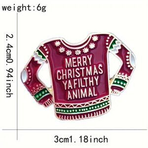 Get into the holiday spirit with our Home Alone Pin! Featuring the iconic quote "Merry Christmas ya filthy animal" on a festive red and green sweater design, this pin is the perfect accessory to add some humor to your outfit. Show off your love for this classic movie with this quirky pin!