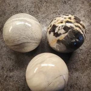 Beautiful set of three marble spheres in natural tones. Perfect for home decor. They all have a flat bottom so they won't roll. They are each 4".