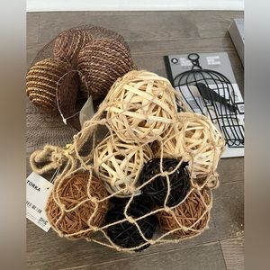 Decorative sets of tweed balls; 2 gold porcelain tea-light candle holders; small gold wall mirror; black “&” sign; black bird cage; and brass key wall accessory.