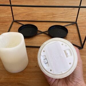 Minimalist, Scandi inspired decor piece. I used to have this in our bathroom decor when my kids were small instead of a nightlight but I am ready to switch things up. It’s a metal framed house with space for 2 candles. I always used these battery operated ones (I am including them, they were $15 each) because I liked the outside is wax but it has batteries to operate. House measures approx 12” x 12”. Message if you have any questions .
