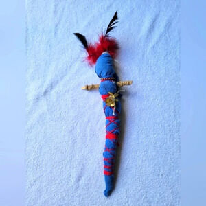 Homemade Doll Blue cloth red string gold bell red and black feathers