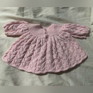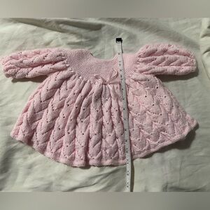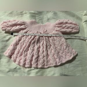 Adorable, homemade, hand knitted baby dress. Closes at the back with buttons. No size tag since itâs homemade. Ribbon bow at the front can be taken out and re-tied - the function is mostly for style. Please review photos with tape measure for sizing visual. My daughter wore it once or twice when she was a few months old. Itâs been washed a few times as well. Please reach out if additional measurements/photos are needed.
