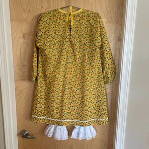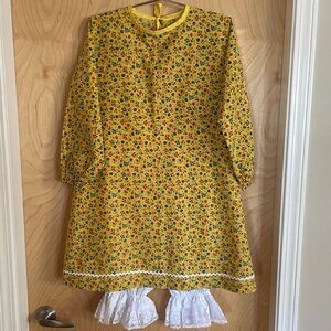 Charming, homemade Raggedy Ann costume. The set includes a long-sleeve floral dress, white apron, white bloomers, and a red crepe paper wig. Made from cotton and in excellent condition, this costume is ideal for Halloween or dress up.