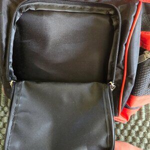 The exterior of the bag is black and red. The interior is white. There is also a netted pouch fir a freezer pack.