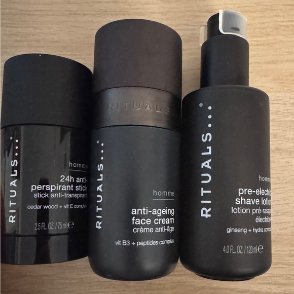 Elevate your grooming routine with the Homme Grooming Set. This sleek black set includes an anti-ageing face cream, a pre-electrical shave lotion, and a 24h anti-perspirant stick. Experience the luxury of with every use.