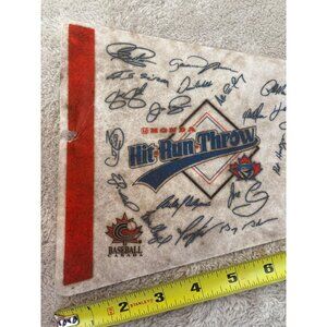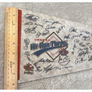 This collectible Honda Hit Run Throw baseball pennant features autographs and a vibrant logo design. Ideal for sports memorabilia enthusiasts.