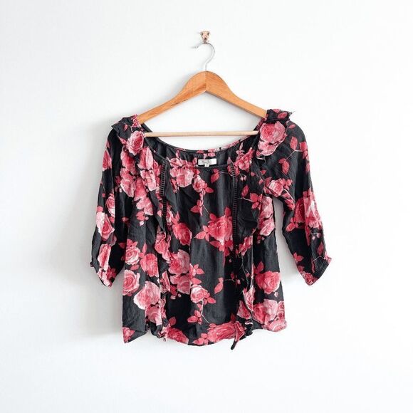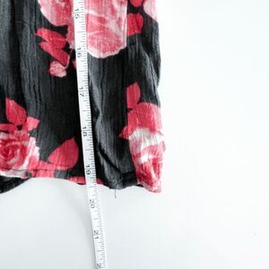 Honey Belle Womens Top Semi Cropped Quarter Sleeve Floral Black Red Medium