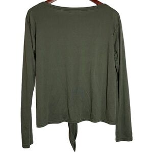 Features: Women's, Metallic stripe tie front tee, banded boatneck, drop shoulders, long sleeves, tie front, metallic striped trim at sides, olive, black, gold, casual, school, work, business casual, loungewear