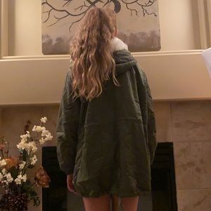 M or small oversized. Khaki green. Zipper, buttons, and drawstring waist. Lined in soft free plush. Enormous hood. Two side pockets.