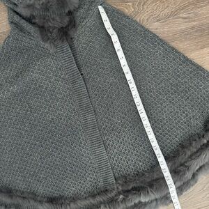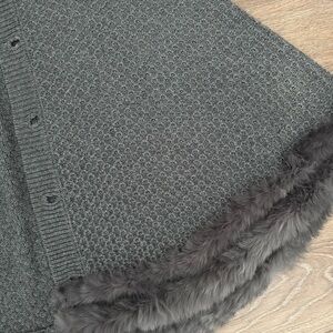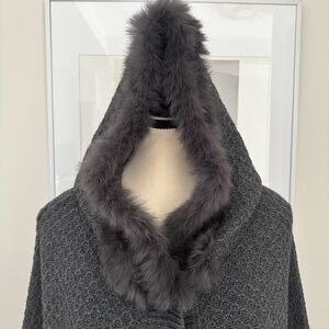 Dolce Cabo hooded knitted cape in grey with real rabbit fur trim. Button front closure, fits all sizes. Worn open or closed.