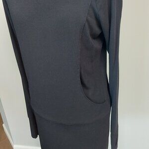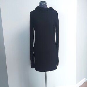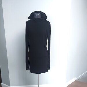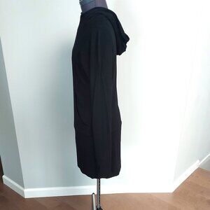 This slip over the head style dress is made of soft, comfortable 95% rayon with 5% spandex to allow for the stretch we all love. The garment feels like your favourite tee shirt, it's so comfy you'll even want to sleep in it . You can wear it all day long with a boot or a sneaker, then throw on a heel and head out for the evening. It is double fabric on the hood, the cuffs and the lower 11 inches (27.94 cm) of the body, the parts that get the most wear, the body shape is straight. This item is in perfect condition as it has only been worn once. I apologize for not being able to capture the details from a distance, I find it difficult with black, but I tried to give close ups of the details. Let me know if you meed more. Measurements are: PTP 18 inches (45.72 cm), waist 16 inches (40.64 cm), hips 17 inches (43.18 cm), length 32 inches (81.28 cm) and sleeve, armpit to cuff, 22 inches (55.88 cm).