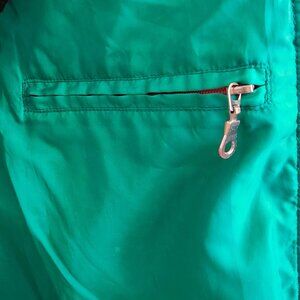 Black with Green lining and pink zipper detail, and zippered pockets