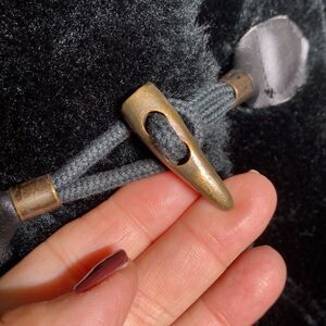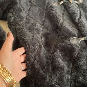 In excellent preowned condition adorable and cozy faux fur duffle coat. Classic styling, with hood, toggle and button closure, side pockets, fully lined. Features a diamond pattern throughout. “Horn” buttons are metal and the chaps are faux leather.