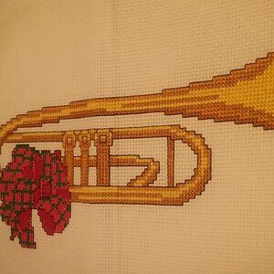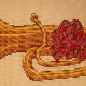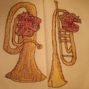 All ready to be framed or turned into an item such as pillows, these are two complete cross stitch pictures of musical instruments. They depict both a horn and a trumpet, each with a bunch of red flowers attached. The instruments are in brown and gold colors.