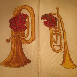Horn & Trumpet Cross Stitched Panels Trimmed with Red Flowers - Ready to Frame or Make into Pillows