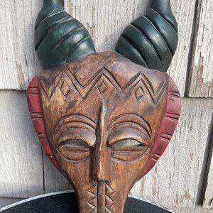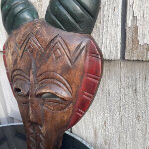 Horned Demon Decorative Tribal Face Mask Hand Carved Wooden 12" length. Light general wear, overall in great condition.