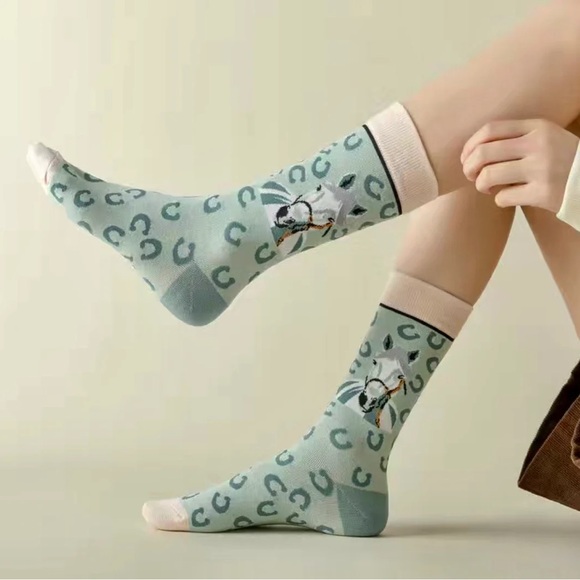 Elevate your style with these chic horse patterned socks. Featuring a unique design in green and cream, these socks offer both comfort and flair.
