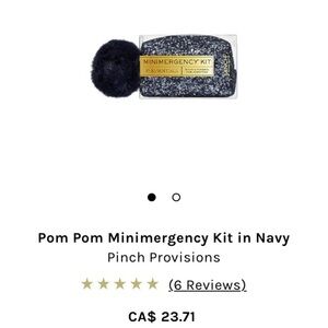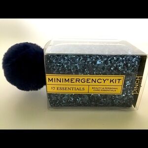 NEW - Navy glitter pouch with faux fur Pom Pom mini emergency kit with 17 essentials. This kit is by “Pinch Provisions”. It has everything you could need in a beauty “emergency “...all