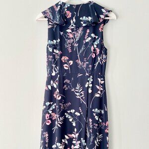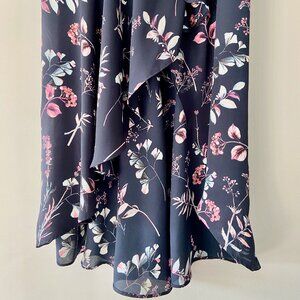 Banana Republic flowy blue maxi dress. Ruffles around the neckline and down the front. Beautiful floral pattern in whites, pinks and blues. Side zipper and slit in the front. Fully-lined. V-neck with clasp. Length from shoulder to hem 147.0cm, length from shoulder to slit 96.0cm. Size 0. Excellent used condition.