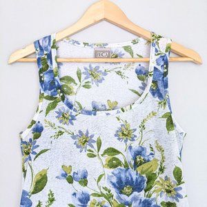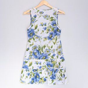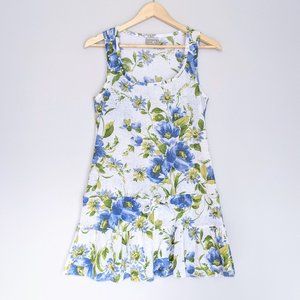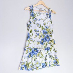 Becca By Rebecca Virtue Swimwear watercolour floral print dress. Perfect for the beach or pool as a dress or swimsuit cover up. Dropped waist with tie. Ruffle hem. 100% polyester. Light, gauzey, stretchy, slightly sheer material. Size M/L. Made in USA.