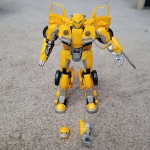 The 18th figure released in Hasbro's transformers toyline known as: Studio Series (SS). This toyline started in 2018 as a Commemorative of the 10+ year anniversaries of the live action movies and is still ongoing. It's aim has been to make updated, more screen accurate figures to the characters from the movies. This one is for the appearance of Bumblebee from his own stand alone movie. The figure in question comes with a multitude of accessories including an optional battlemask face, a swappable gun emplacement for his right arm, and a detachable blade for either arm. The blade accessory in question is missing one of its 2 locking tabs, but still attaches to either arm relatively securely. All accessories can be stored on the figure in both robot and vehicle mode and don't hinder either modes functionality.