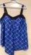 This attractive tankini top is shorter in the back than it is in the front. It has ruching between the cups, and boning on the side of the cups.