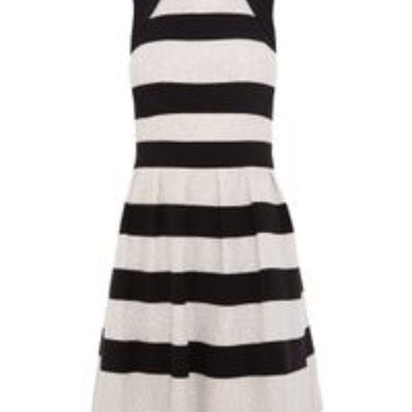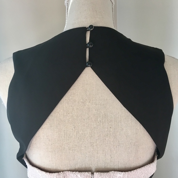 This dress has so much personality! Bold stripes and sophisticated lace, open back & button closure at neck. Oh, and it also has boning and a built in crinoline!. Spare button is attached to fabric care label. Fully Lined w/ boning & crinoline.