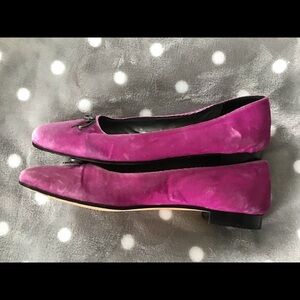 Kate Spade New York velvet flats with silver-string bows. Very pretty shade of fuchsia/pink, soft velvet. Some signs of wear (see photos for closeups), but not really noticeable when worn…the velvet looks different in the pics depending on the direction you smooth it.