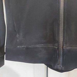 Jacket is in used condition, has several areas affected by "Wash Wear" (See Photos) Zipper pulls are also paint chipped, no hood