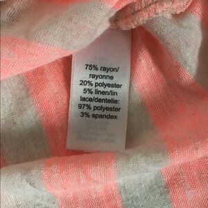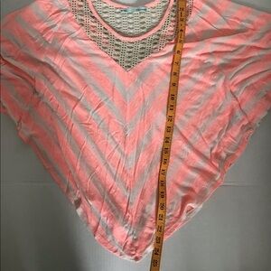 Beautiful batwing/dolman sleeved top with white/pale pink chevron stripes. Pretty crochet-style detailing at the front and back necklines. See pics for measurements.