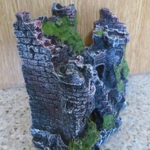 A fairytale ruined castle, includes three towers, steps, a walkway and arch, with faux resin "greenery" that has overgrown. Perfect for your aquarium or terrarium!