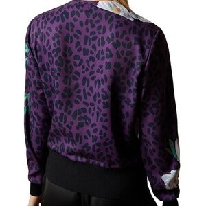 Ted Baker Willow Wilderness Zip Bomber Cardigan in 'black' displays an all-over contrasting pattern of purple leopard print and floral designs and finished with a gold zip closure. Layer over an all-black outfit for a stylish update.