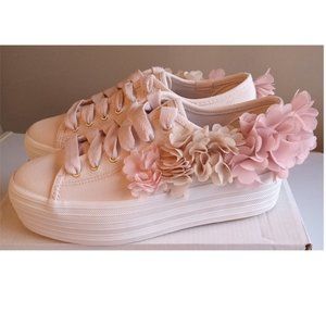 New in box/never worn Keds Celebration Limited Edition Triple Up pale pink lace-up platform sneakers with adorable fabric floral appliques. Cotton canvas uppers, rubber & PU outsoles, Softerra comfort cushioned footbeds and 1.5" platform. These are the cutest sneakers EVER! Size 5 *There are some dents, dings & damage to the box only*
