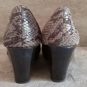 Check out these stunning shoes! They're beautifully designed in a gorgeous blend of brown and beige, with a soft snakeskin pattern that's perfect for the Summer and Fall seasons. These shoes feature a comfortable 2.5" wedge heel, a round toe, and are accented with a cute bow. The cushioned insole and synthetic non-slip sole make them both stylish and practical. They're a size 7B and in like-new condition. Plus, you can easily pair them with almost anything from pants and denim to dresses. It's where comfort, function, and fashion all meet! And here's the best part: if you're new to Poshmark, you can sign up using referral code "Cookie23NB" to receive $15 CAD toward your first purchase.