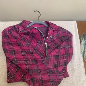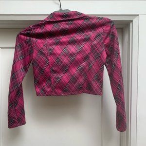 Pink, black, and white tartan zip up jacket by Knitworks.