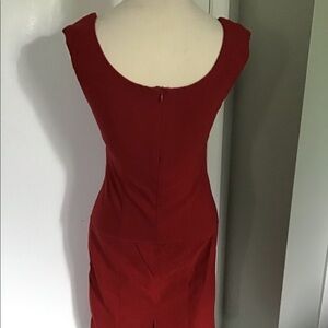Beautiful “Candy Apple” red cocktail dress with back zipper closure and small slit at the back. This dress is beautiful on its own, or paired with a blazer or cardigan/shrug. See pics for measurements.