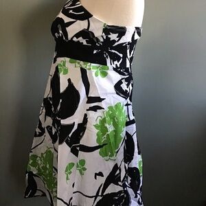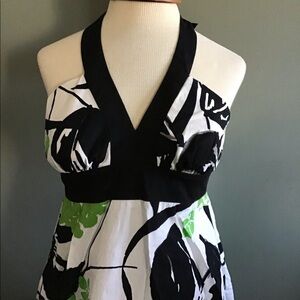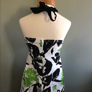 Beautiful midi-length dress with halter-style tie-ups and empire waist. Zippered back closure. Striking white/black/green floral motif. Lightweight cotton-blend fabric. In excellent shape. See pics for measurements.