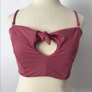 Pretty shade of “dusty rose”, this ribbed bikini set has adjustable and removable straps and a knotted front tie that creates a “keyhole” look. In excellent condition. Washed but never worn. See pics for measurements.