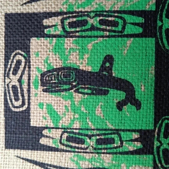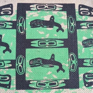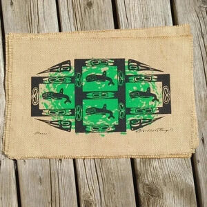 I think these could go back to at least the 70's and maybe the 60's. I don't ever remember using these. But my parents honeymooned in coastal BC and south Alaska in the mid 60's. They feature Tlingit Formline art of the Blackfish (also known as Orcas). There is a possible signature, but I couldn't find any answers on the Internet. There is a bit of a mark on one, I assume it would wash out. I'm pretty sure that they are made from natural fibers, maybe some type of burlap. That was a common placemat material back then. The back of one of the others has some paper or something like that stuck on. It's loose around the edges and maybe it will just come off. Maybe that was the packaging.