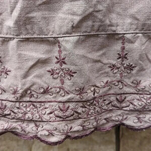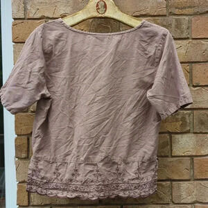 This beautiful short sleeve pale burgundy blouse is from my own closet from the days before children when I had a disposable income. It features a fancy floral embroidered border at the bottom and a scalloped hem. Because this is made of hemp, its still in excellent worn condition.